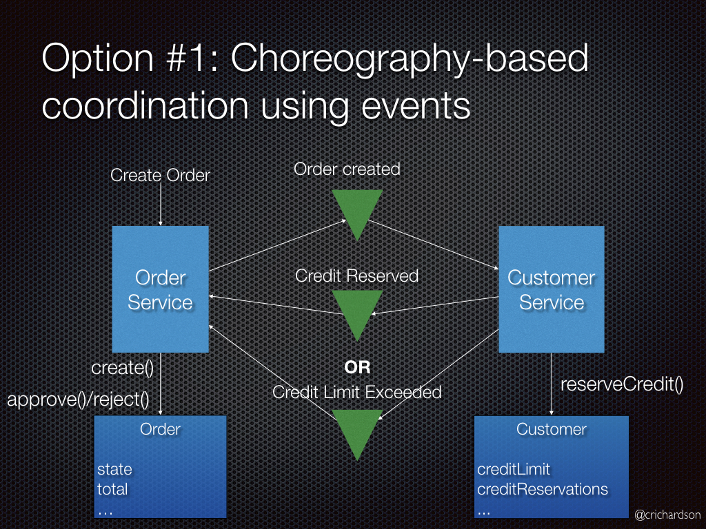 Хореография(Choreography) - каждая транзакция публикует события, которые запускают транзакции в других