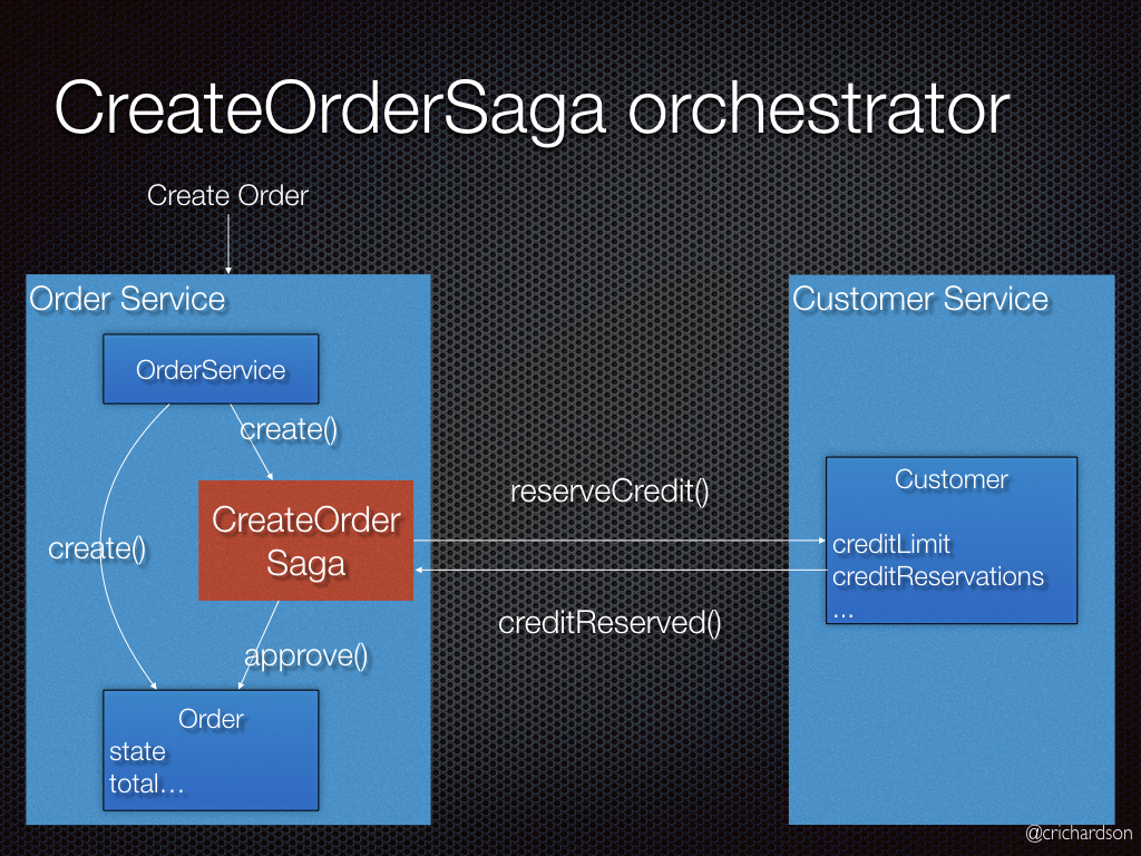 - CreateOrderSaga (СагаСозданияЗаказа) отправляет команду ReserveCredit (ЗарезервироватьКредит) в Customer