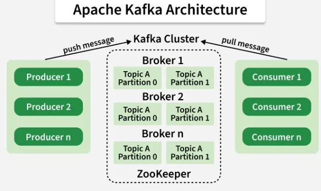 - Kafka cluster - логическое объединение Kafka Brokers под управлением ZooKeeper.